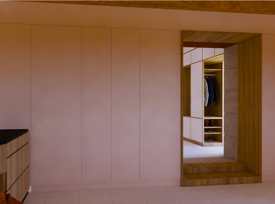 Le défi principal résidait dans la présence de multiples trappes techniques sur le mur destiné à l’aménagement. Ces accès, indispensables pour la maintenance des installations, ont nécessité la conception d’un meuble sur mesure, doté d’ouvertures discrètes en partie arrière. L’objectif ? Allier esthétique et praticité, sans compromettre l’accès aux éléments techniques.