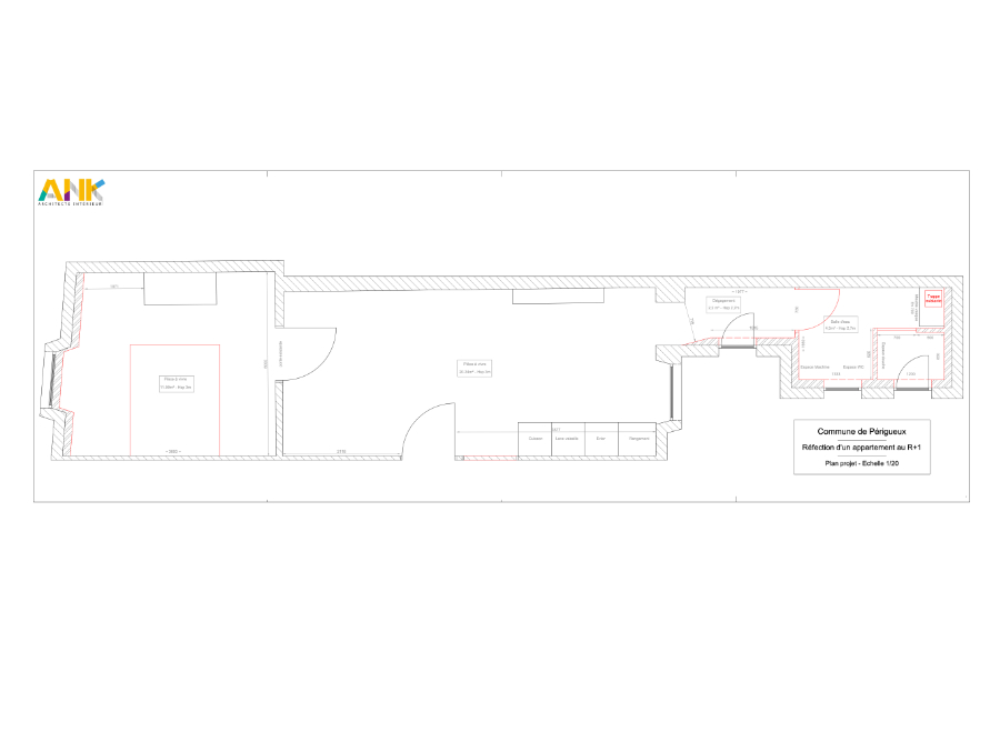 Contrairement à celui du RDC il m'a fallu penser le reste de l'appartement. J'ai donc proposé à mes clients d'abattre une cloison pour donner une pièce à vivre plus spacieuse et adosser la cuisine contre le mur qui donne sur le palier afin de ne pas toucher à la cheminée existante et qu'ils souhaitaient conserver pour l'atout charme du lieu.