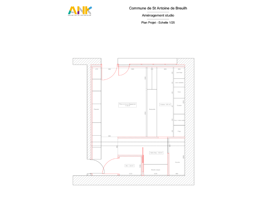 Ces clients ont fait appel à moi afin de transformer un espace en studio pour le louer occasionnellement. L'espace était vierge de tout aménagement, juste clos couvert, il fallait donc imaginer un projet avec les fonctions suivantes : un espace à vivre avec une belle cuisine, une chambre indépendante si possible (ou une solution ingénieuse à défaut), une salle d'eau, des toilettes séparées et des rangements.